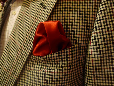 The pièce de résistance though was the red satin pocket square. This was actually a ladies top which I brought home to my beloved, asking her very nicely if she would cut it up and sew a hem around it.