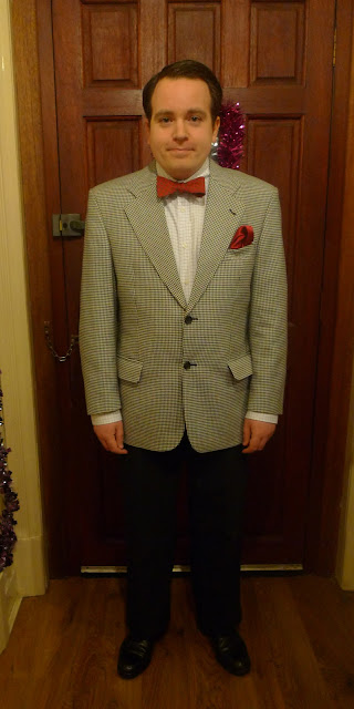 I had tremendous fun visiting the local charity shops and managed to cobble together a rather dapper outfit for the grand total of £37.94. This consisted of sports jacket, shirt, tie, trousers, shoes and pocket square.